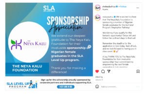 The Neya Kalu Foundation sponsored a number of female Nigerian graduates in the She Leads Africa EmployHer Pathway Program. This sponsorship is aimed at sponsoring a group of exceptional Nigerian female graduates, allowing them to take the next step in their careers.